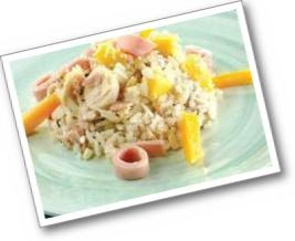 Em uma panela, aqueça o azeite e frite a cebola. Adicione o palmito e mexa. Desligue e crescente o presunto e a manga. Em um recipiente, coloque o arroz cozido. Junte o refogado as azeitonas, a cebolinha, o queijo ralado, orégano e a pimenta. Coloque em um refratário e decore com a manga e/ou fatias de presunto .